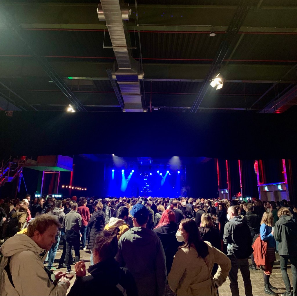 Das erste Mal Ausgehen ohne Baby. Menschen, so vielen Menschen! Wir müssen uns durch sie hindurch zwängen, um zu den Toiletten zu gelangen. Wenige tragen Maske. Am Einlass wurde nicht mal der Impfstatus kontrolliert und ich fühle mich wie 2019. Maske an oder Maske aus? Ich weiß nicht was ich tun soll. Mit der Maske bin ich mittlerweile vertraut, fühle mich wie Sheherazade aus 1001 Nacht. Ich mag es, wenn man mein Gesicht nicht vollständig sieht, habe Gefallen daran gefunden, in der Öffentlichkeit unbemerkt Grimassen zu schneiden und meinem Resting Bitchface freien Lauf zu lassen. Also behalte ich meine Maske an, nur um sie im stickigen Konzertsaal wieder unters Kinn zu schieben, um besser atmen zu können.